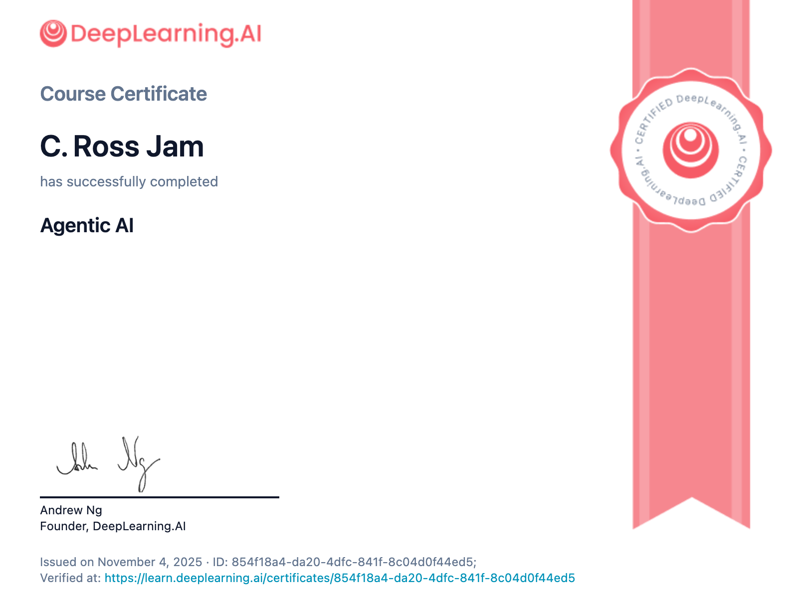 I completed Andrew Ng’s course “Agentic AI” at DeepLearning.AI and received a certificate of completion for it. Previously the site only had “accomplishments” for short…